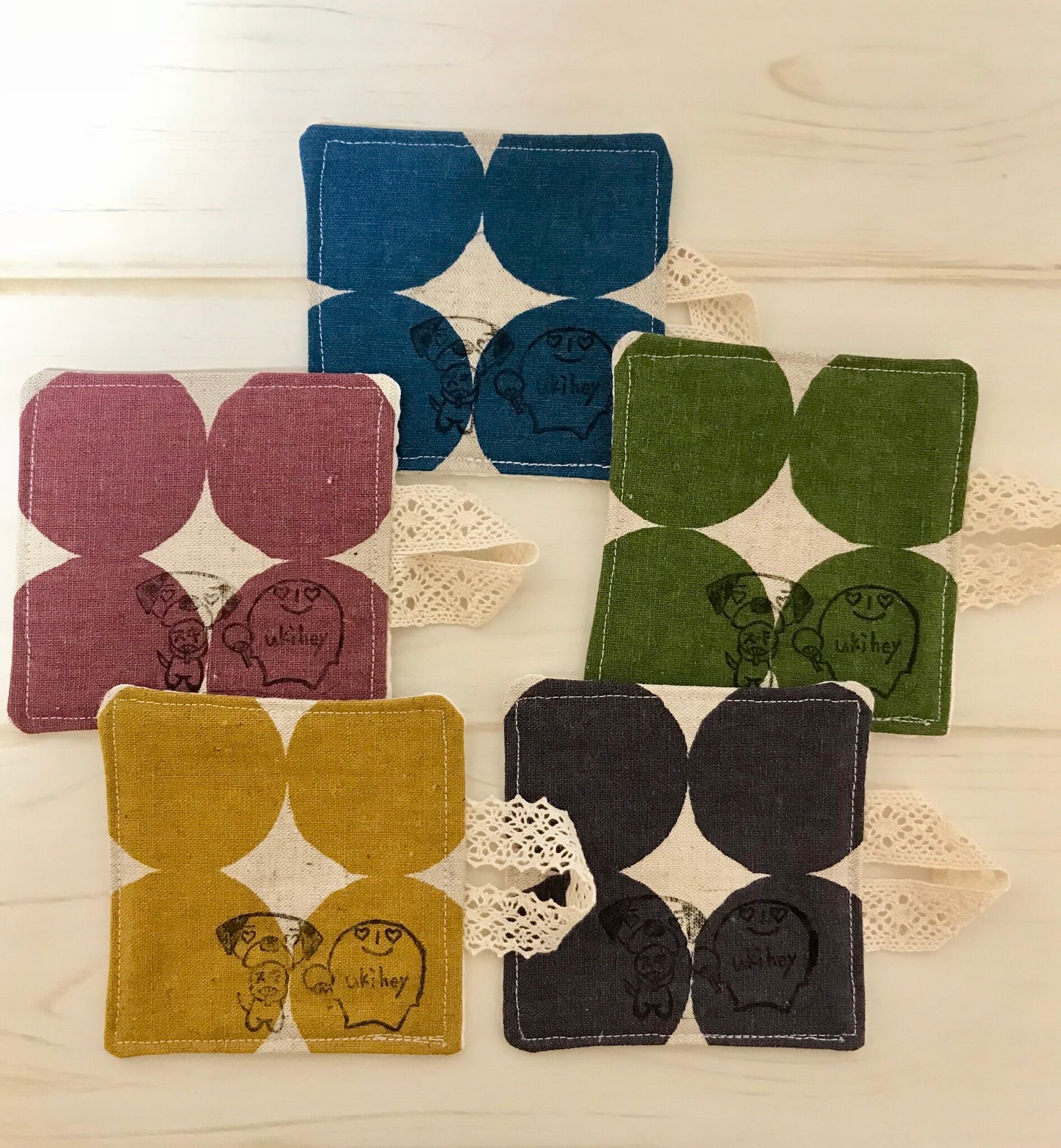大人っぽい色合いに、ポワンと広がる大きな水玉。中には当店の妖精?ウキヘイと、お友だちのワンタが愛たっぷりに応援してる消しゴムはんこを押してあります!